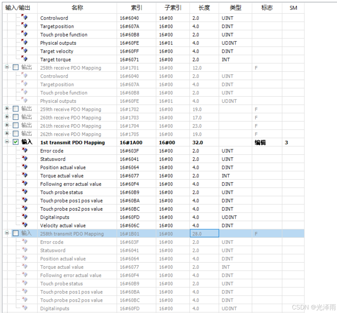 SM=3 :非常典型,表示这个TxPDO通过同步管理器3(SM3) 发送给控制器。这是EtherCAT从站(驱动器)输出过程数据的标准配置。