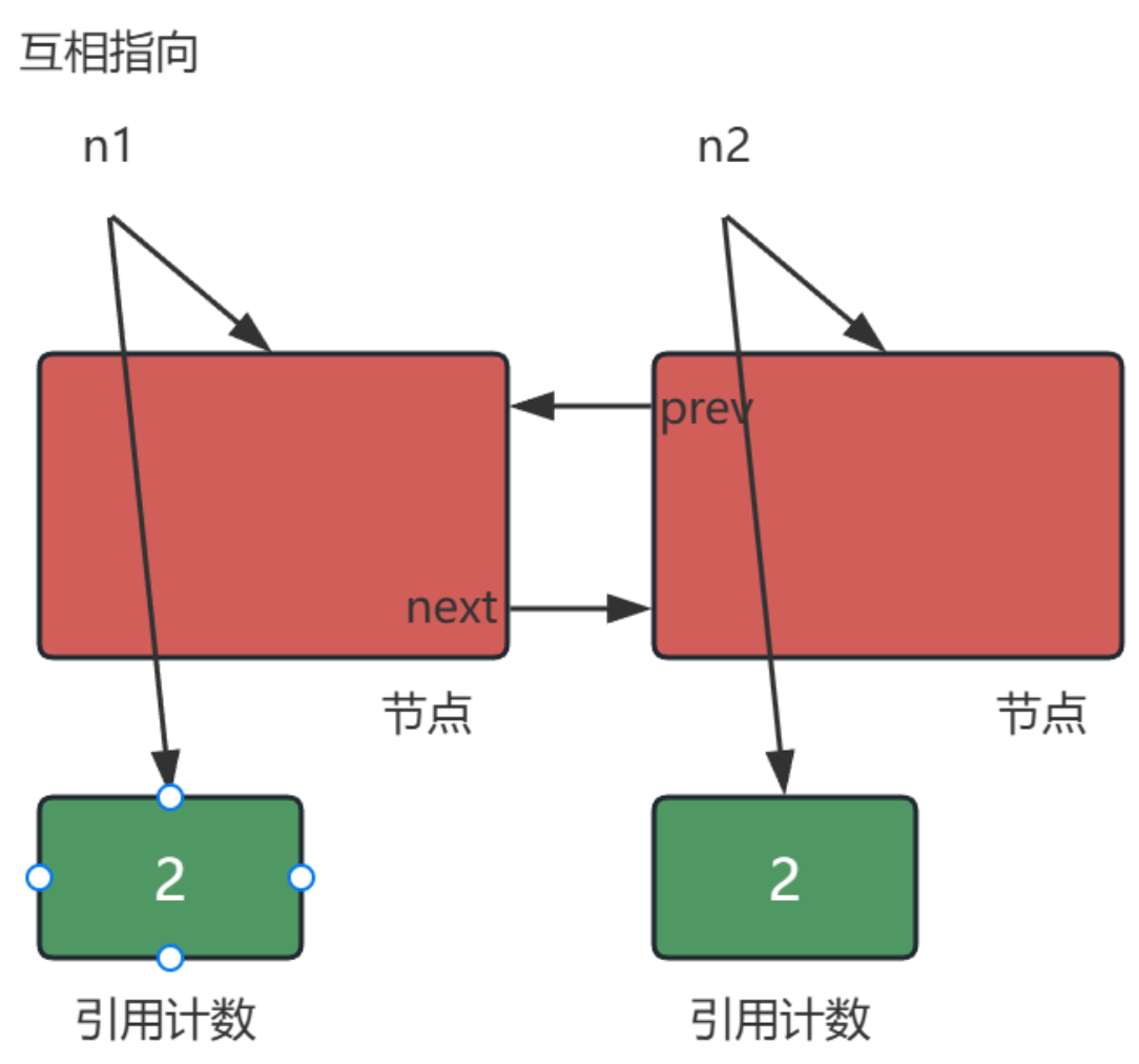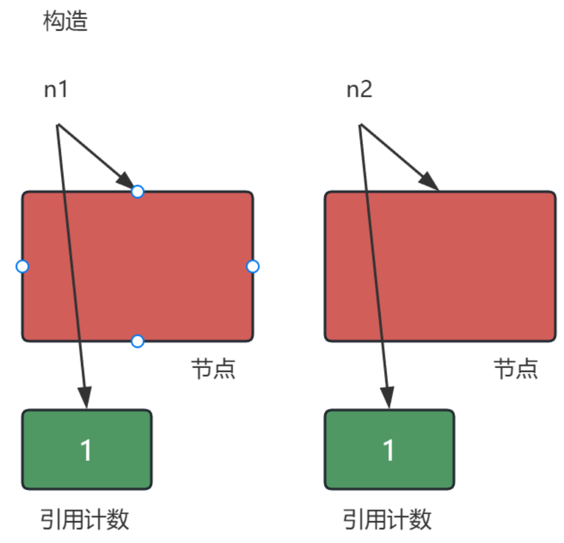 - 如下图所述场景,n1和n2析构后,管理两个节点的引用计数减到1