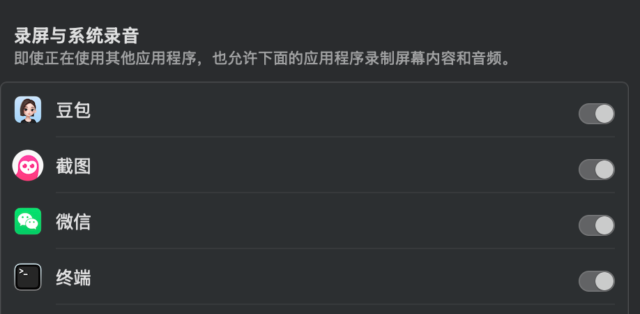 打开 系统设置 → 隐私与安全性 →录屏。点击 ➕ 或者 +号