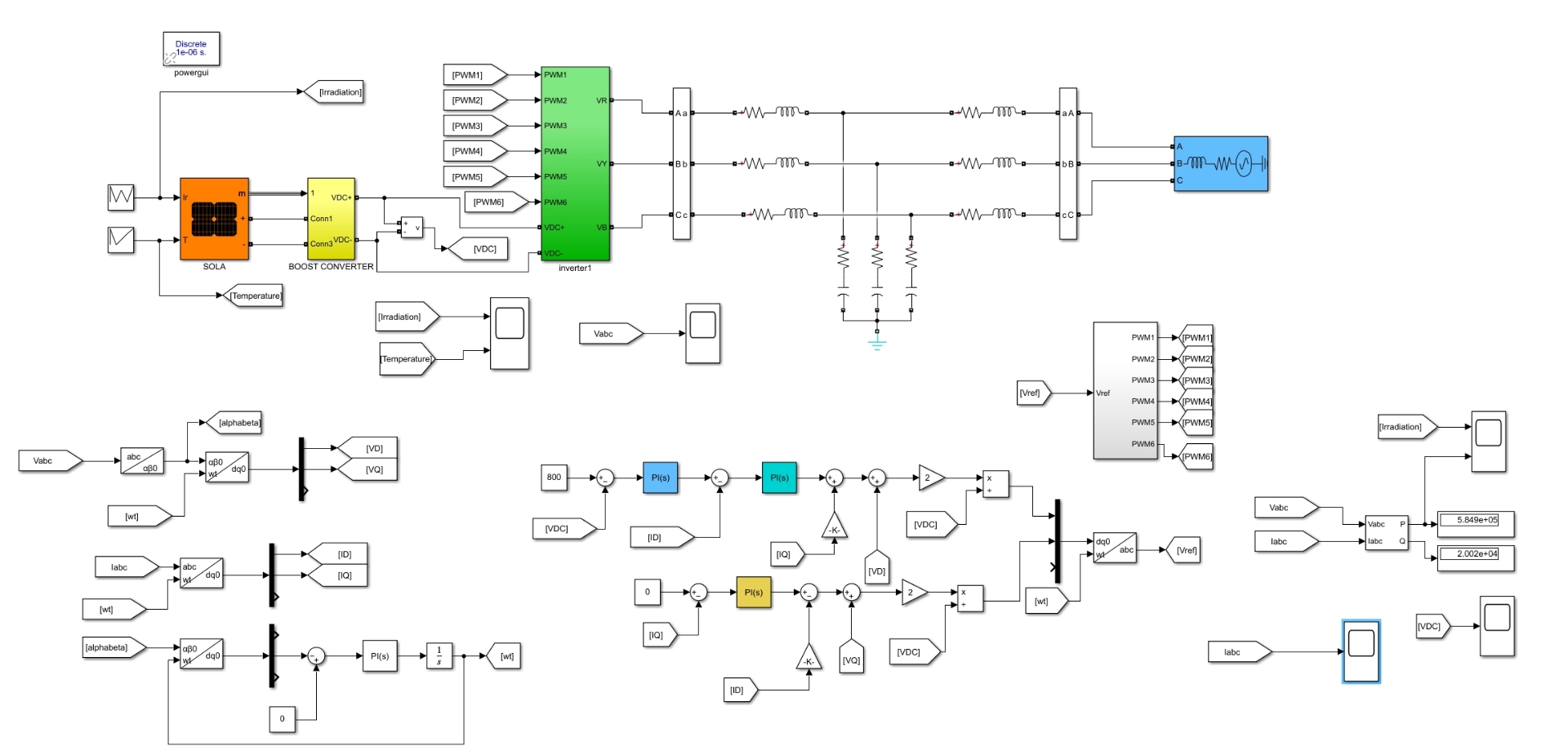 两极三相光伏逆变并网仿matlab2021a 采用mppt算法,扰动观察法,采用spwm调制, 控制环采用双环PI调节, 逆变器采用三相桥式逆变器,坐标变换含PLL锁相环,逆变器输出端加设LCL滤波器。