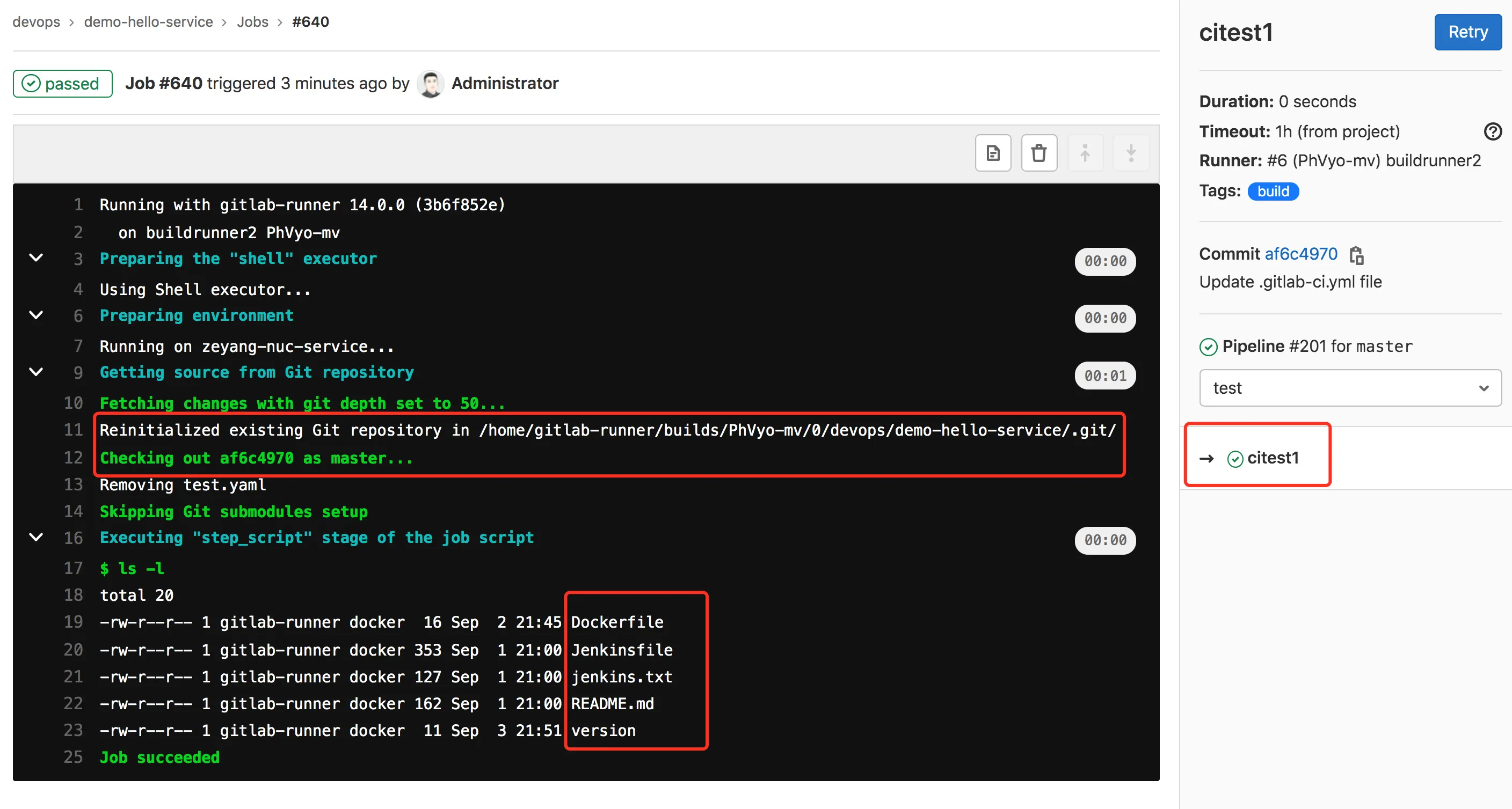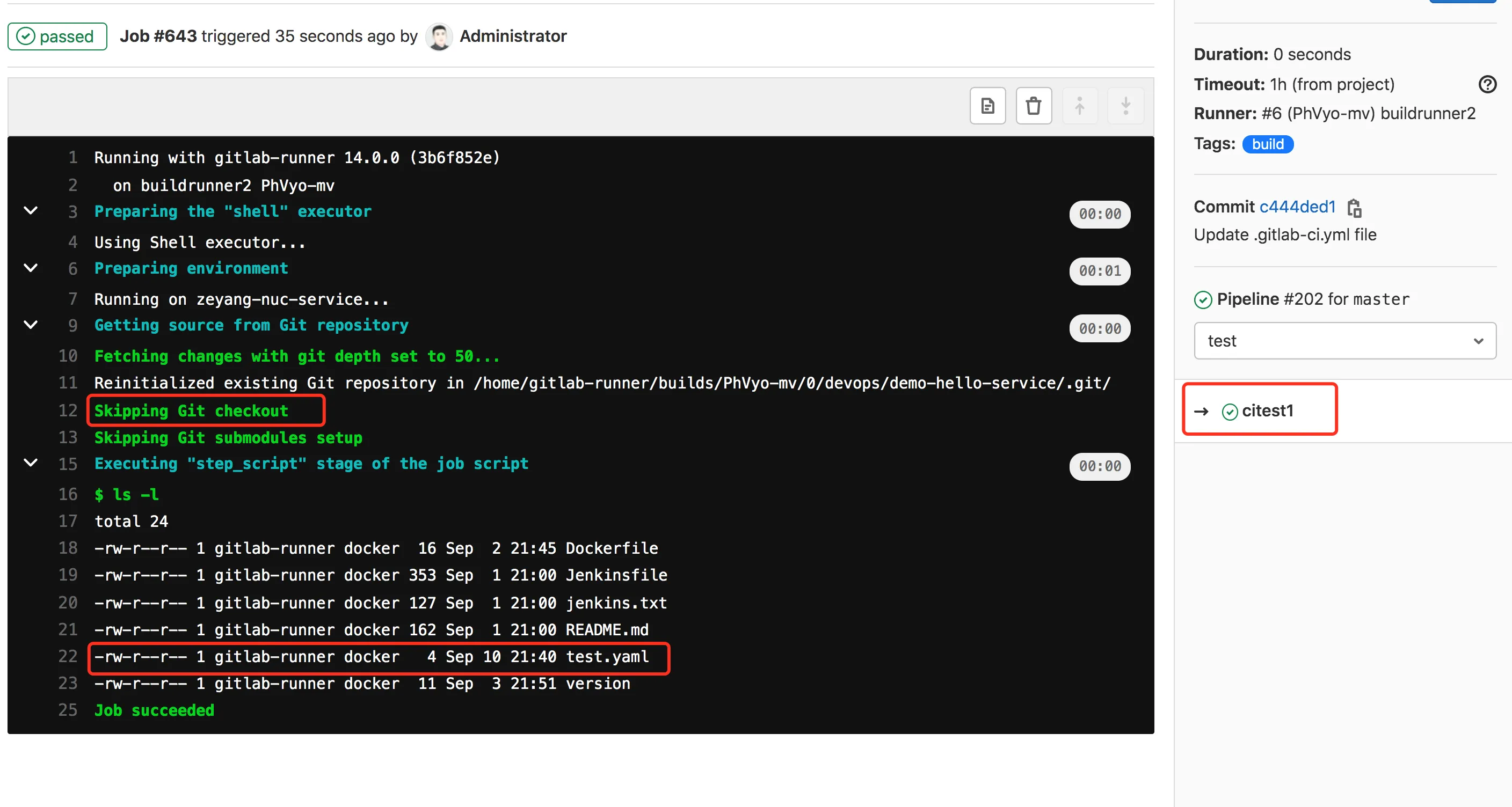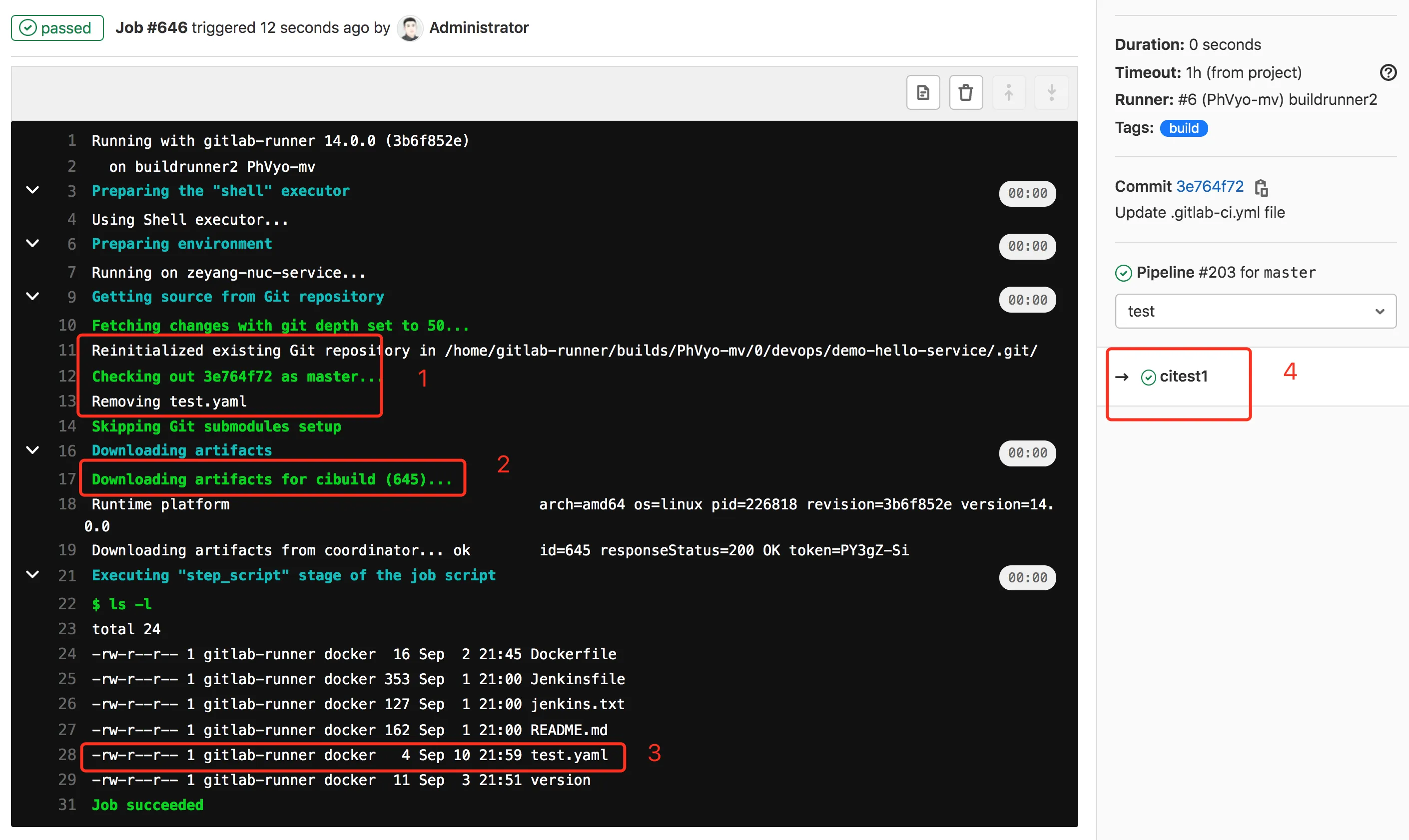 查看结果:citest1作业会下载cibuild作业生成的制品;