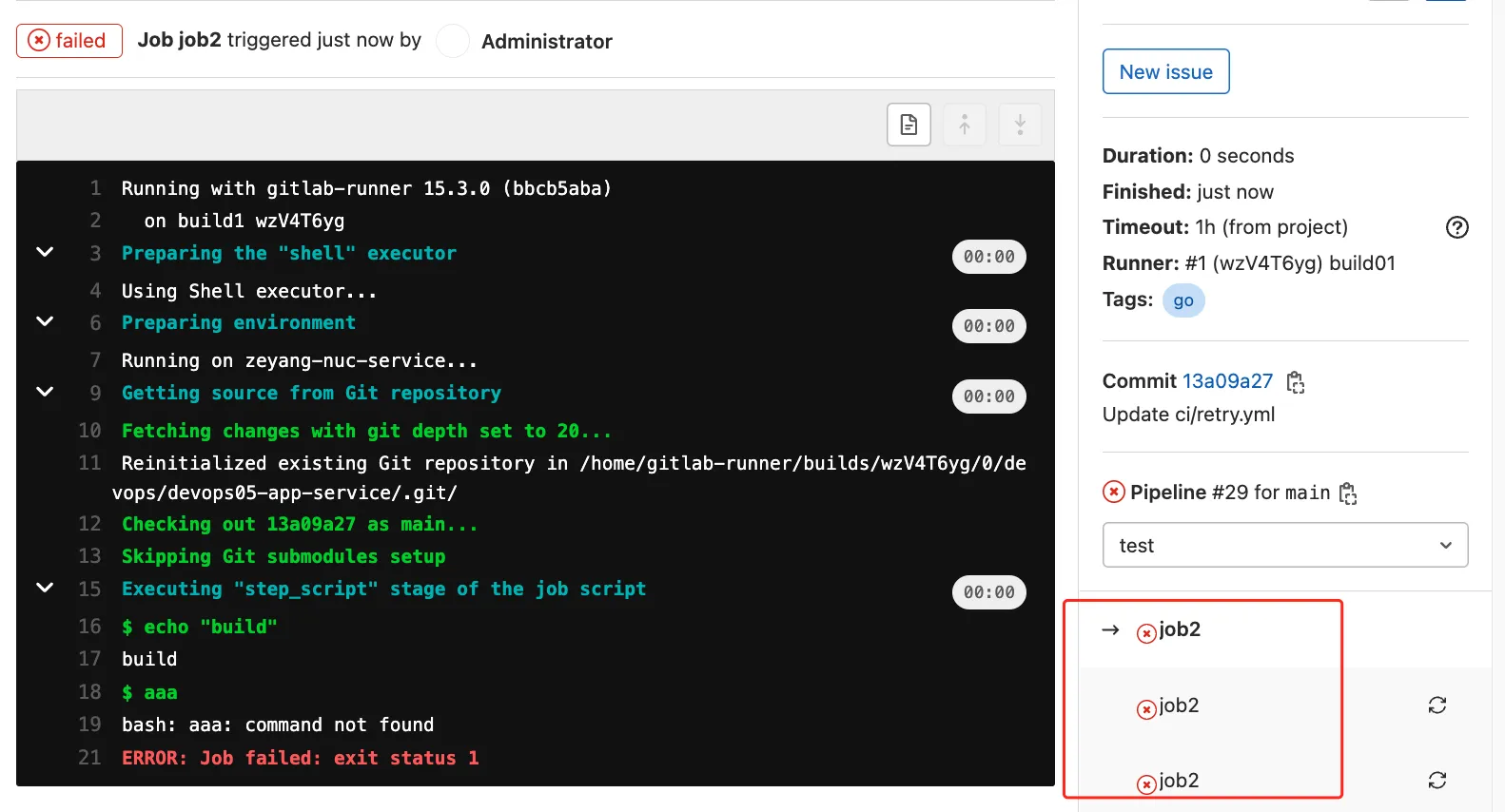 分析: citest1作业并没有获取上个阶段产出文件, 因为默认每个作业运行时都会重新下载代码;重新下载代码会把其他文件删除掉;
