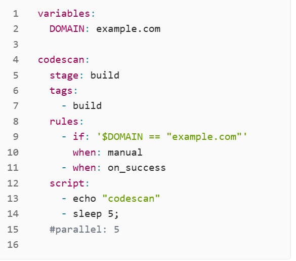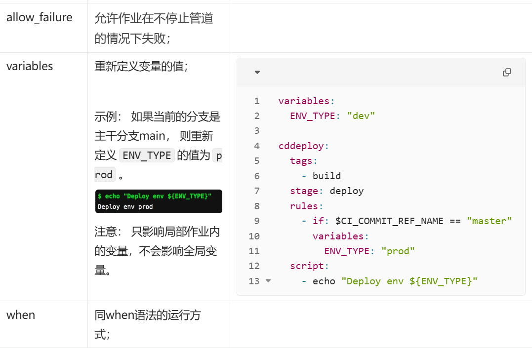 | when | 根据状态控制作业运行, 当前面作业成功或者失败时运行。 | * on_success 前面阶段成功时执行(默认值); * on_failure 前面阶段失败时执行; * always 总是执行; * manual 手动执行; * delayed 延迟执行; * * start_in * * * '5' * 5 seconds * 30 minutes * 1 day * 1 week * never 永不执行; |