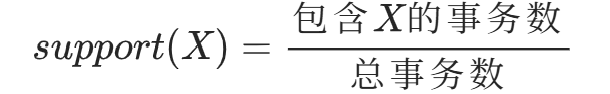- 支持度(support) :某项目集在事务数据库中出现的频率,公式: