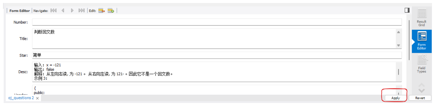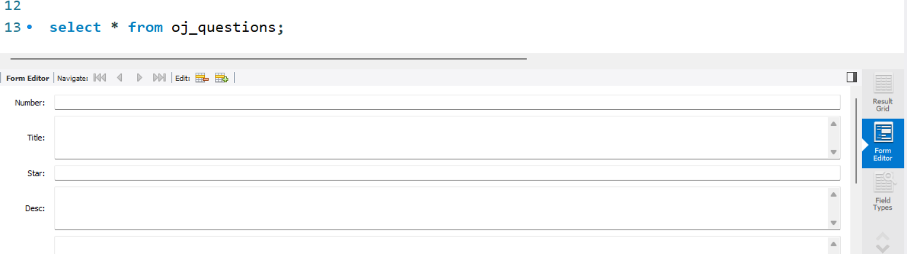 执行select * from oj_questions;后,点击Form Editor即可开始插入数据。