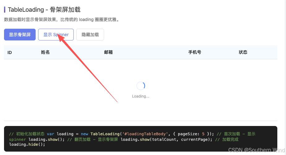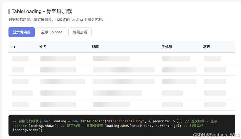 第三个痛点是加载状态太单调。 一个转圈圈的 loading 用了十年了,用户早就审美疲劳了。骨架屏明显更现代,但是每个表格都要手写骨架屏 HTML,太累了。