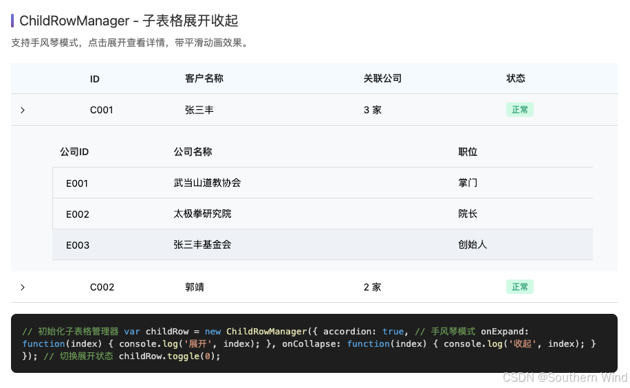 | ChildRowManager | 子表格展开/收起 | 需要查看详情或关联数据时 |
