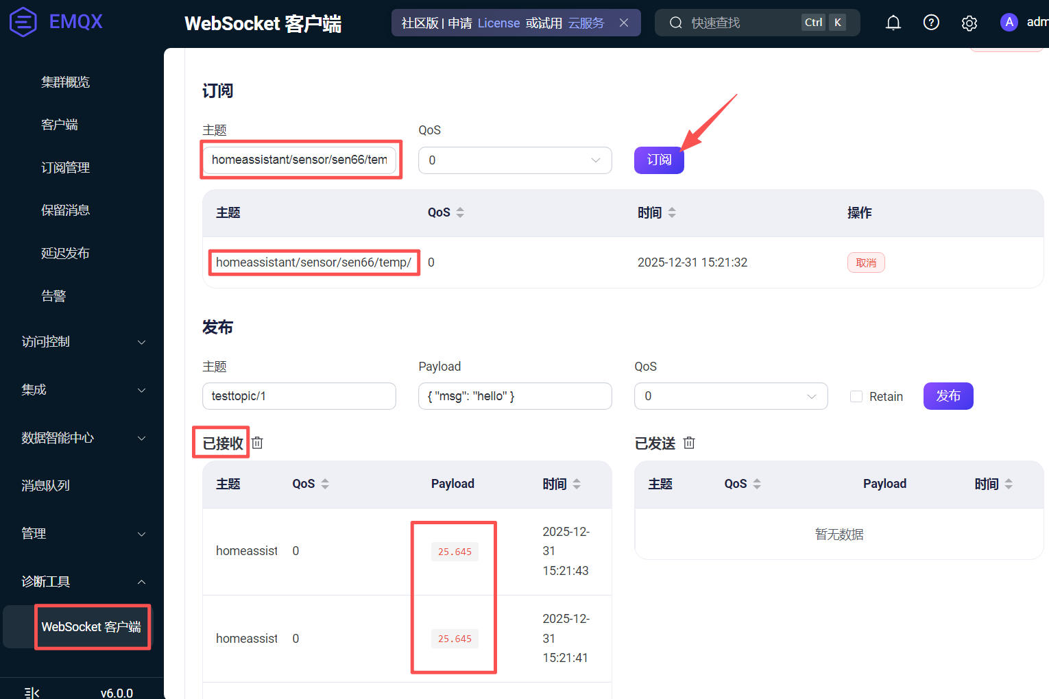 homeassistant/sensor/sen66/temp/state,点击订阅按钮; - 在已接收版块可看到传感器数据,两秒更新一次;