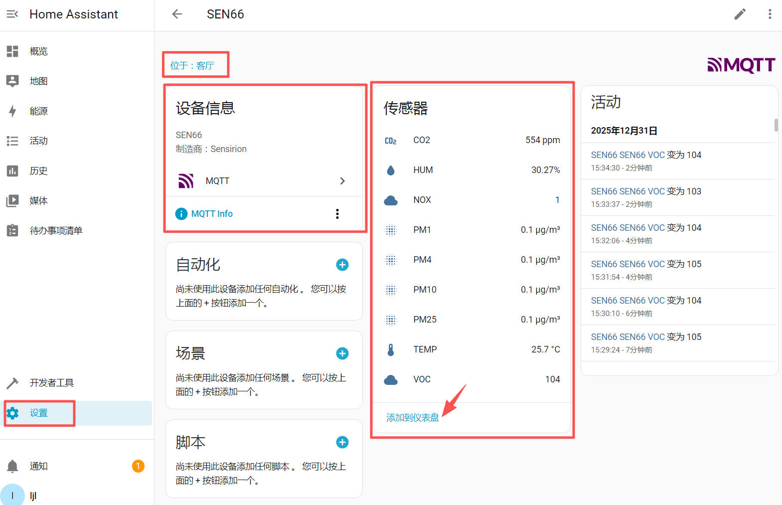 通过 MQTT 协议上传 SEN66 传感器数据至 Home Assistant 平台,实现远程 IoT 数据实时监测。