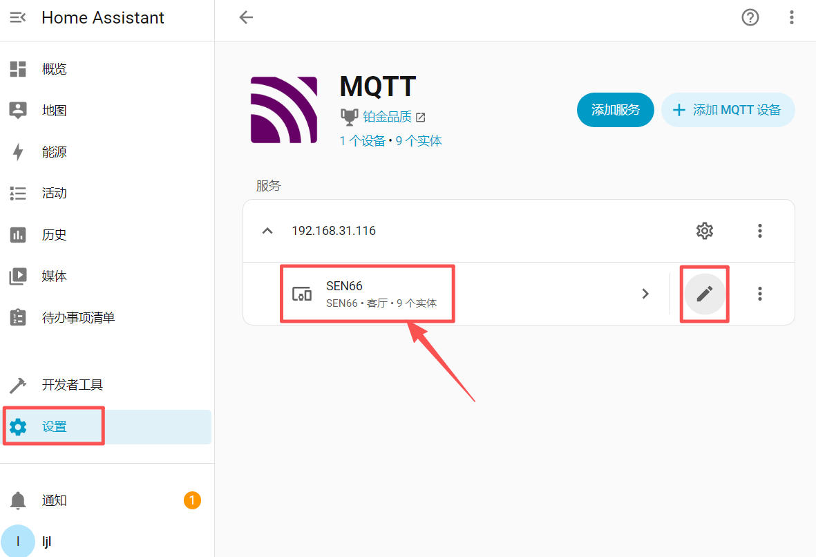 打开 Home Assistant 网页界面 http://192.168.31.118:8123 ,在 设置 - 设备与服务 标签页添加 MQTT 集成;