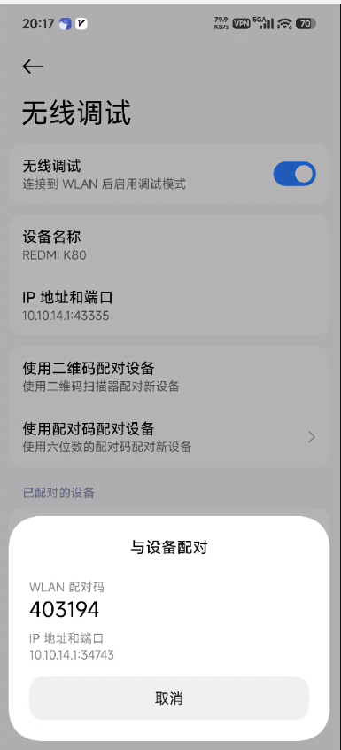 现在转到步骤2里面的无线调试页面,开启开关,点击使用配对码配对设备。