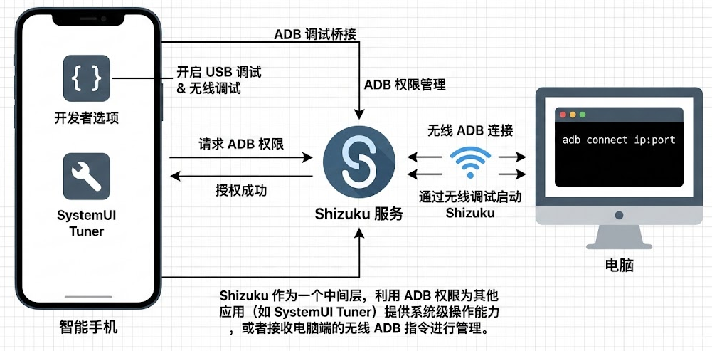 - Shizuku 是 ADB 权限的"容器"和"分发者"。它将原本只能通过文本命令行交互的 ADB 权限,封装成了现代化、程序友好的 Java Binder 接口,供设备内的 App 直接调用。