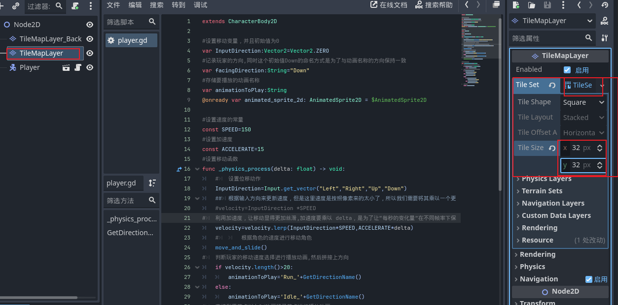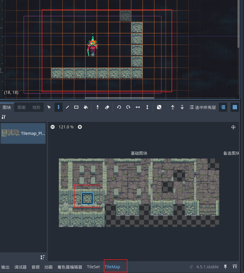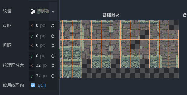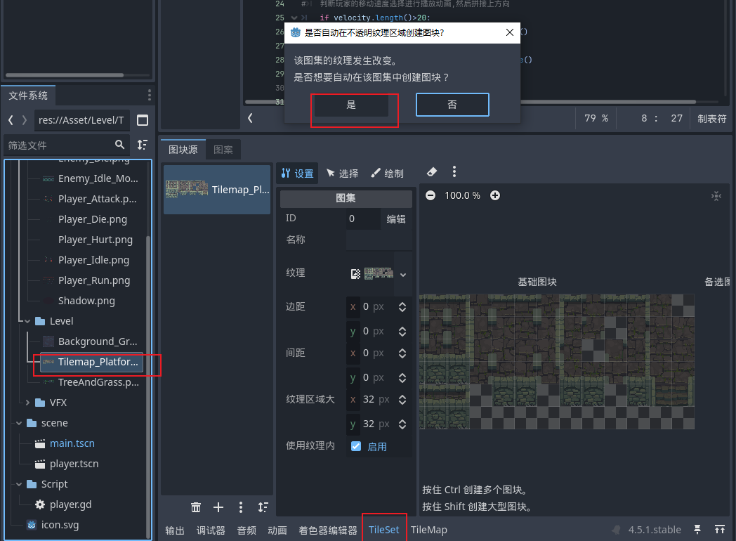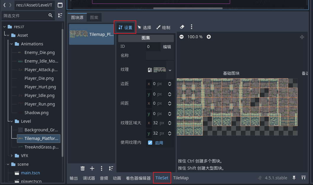 - 创建与调整:在主场景根节点新建瓦片地图层,移至玩家场景上方,建 32*32 尺寸瓦片集,拖素材文件设瓦片源。