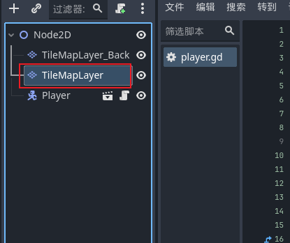 - 然后我们新建的瓦片地图层会在玩家场景的下面,我们需要移动这个节点到玩家场景上面,不要遮挡玩家角色
