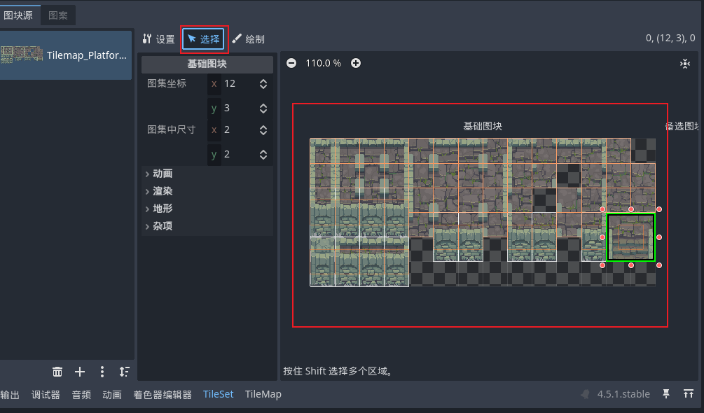 - 然后我们切换到选择模式,将组合瓦片进行选择一下,只要选中瓦片然后选择边边的点进行拉动就好了
