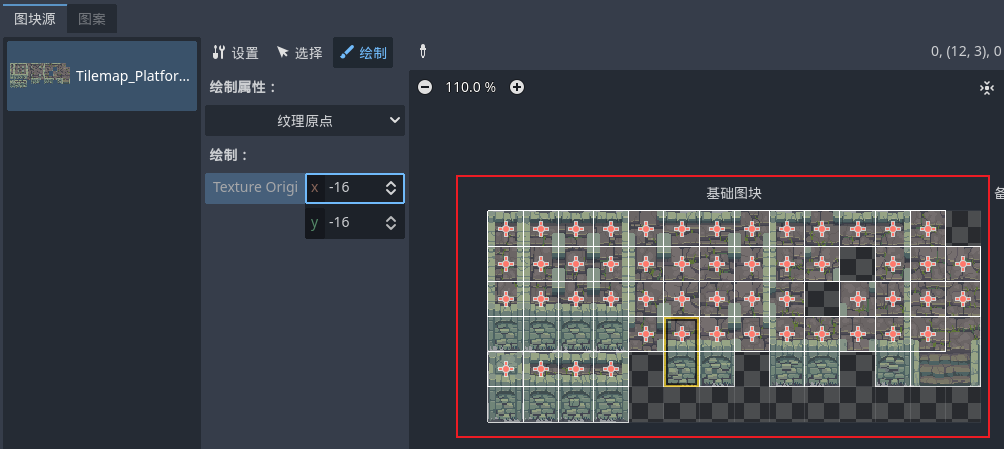- 要处理这个问题,我们点击进入绘制模式,然后将绘制属性改为纹理原点,然后改y轴为-16之后,依次点击我们的组合瓦片,像图中的左边的瓦片组合我是点过了,然后就是正常了,不正常的就是那个红色的十字不是在一块的中间。