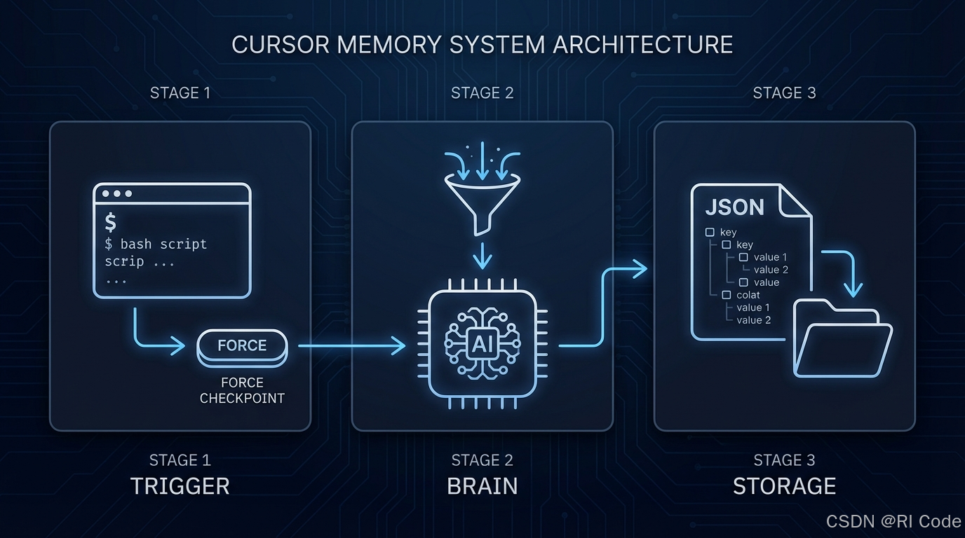 Cursor Memory 的核心理念在于结构化提炼。它不保存"你说过的话",而是保存"你做出的决策"、"你纠正的错误"和"你发现的模式"。