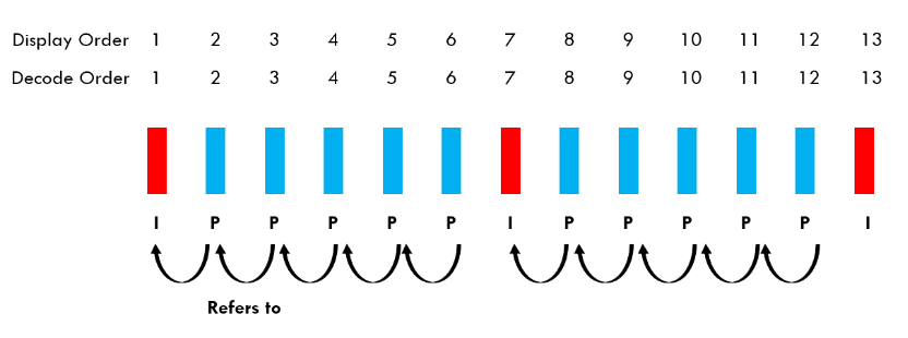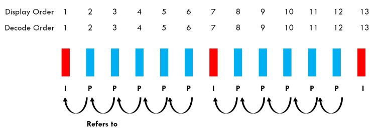你可以在上图中看到 I 帧和 P 帧。如前所述,P 帧指的是之前编码过的 I/P 帧。你还可以看到,帧的编码/解码顺序与它们呈现给用户的顺序相同。这是因为 P 帧仅引用之前编码过的图片。