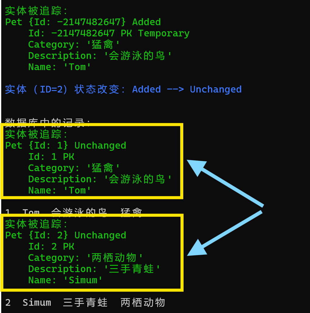 首先,new 了一个 Pet 对象,赋值,再调用 Add 方法添加到数据集合中,此时状态会被改为 Added。Tracked 事件输出第一块绿色字体,表示实体开始追踪的状态为 Added,ID 值是随机分配的负值,并说明是临时主键值。