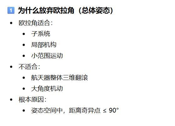 欧拉角是非常好的构建模块,非常有用,也是一个基础性的东西。但对于一般的航天器三维运动,我通常不会使用欧拉角。