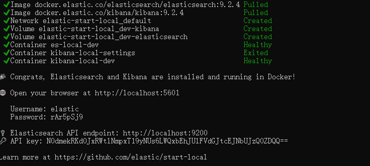 在命令行中运行 start-local 脚本即可完成本地 Elasticsearch 和 Kibana 的配置。参照官方文档: