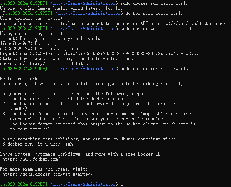 运行 hello-world 镜像以验证 Docker 是否安装成功: