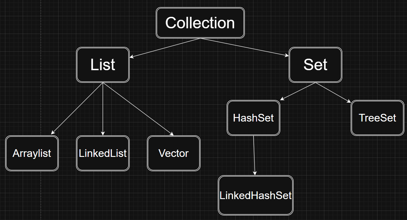 其中Arraylist,LinkedList,Vector,HashSet,TreeSet,LinkedHashSet 是实现类,Collection,List,Set是接口