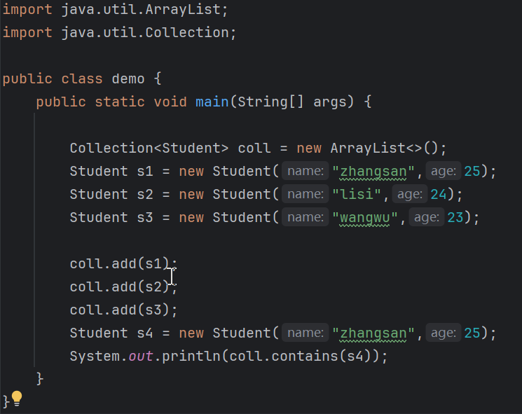 contains()的底层原理 :它依赖equals()方法来判断对象是否相等。- 自定义对象的默认行为 :如果