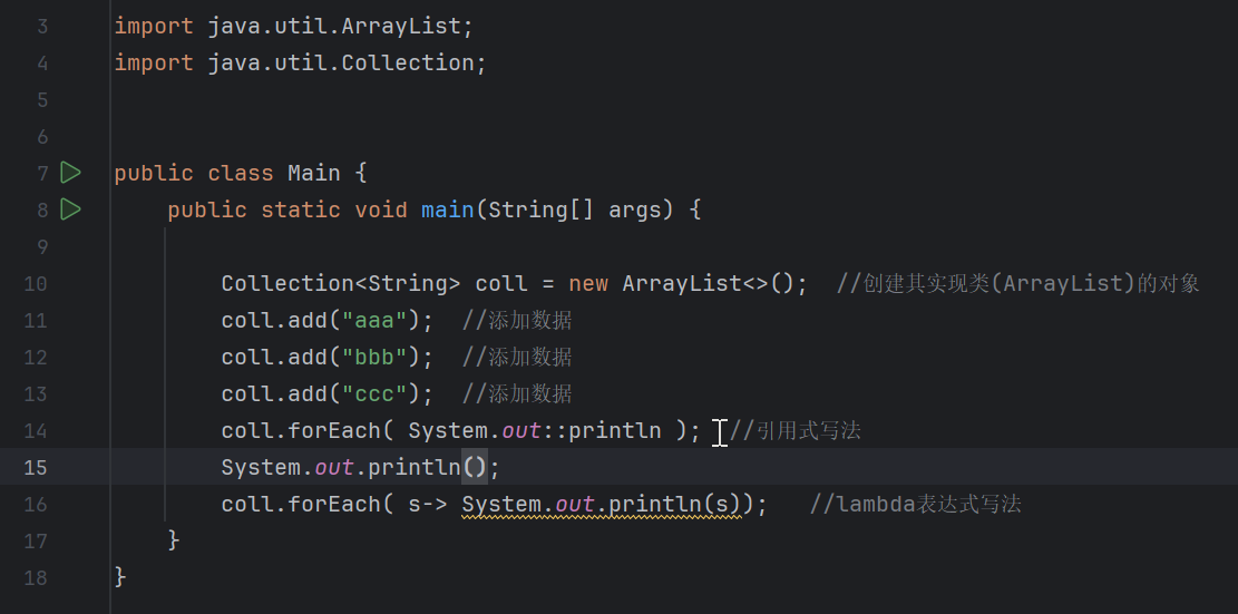 Iterable接口的默认方法forEach(Consumer<? super T> action)。 Consumer是一个函数式接口,正好可以用 Lambda 表达式来实现。- 这种方式无需手动获取迭代器或写循环结构,直接传入一个 "对每个元素要执行的操作" 即可。