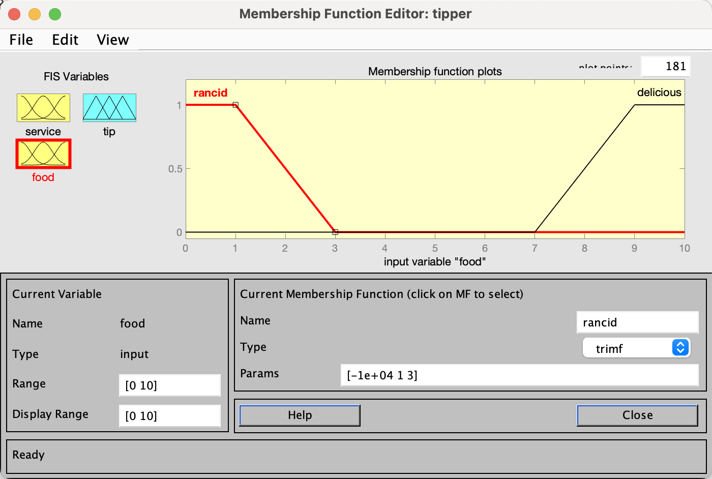 同理,编辑food,food只有在特别难吃与特别好吃时,才影响小费金额。隶属度选择三角形隶属函数(trimf),即评分在0-1分时,为特别难吃,评分在9-10分时为特别好吃,编辑完画面如下。