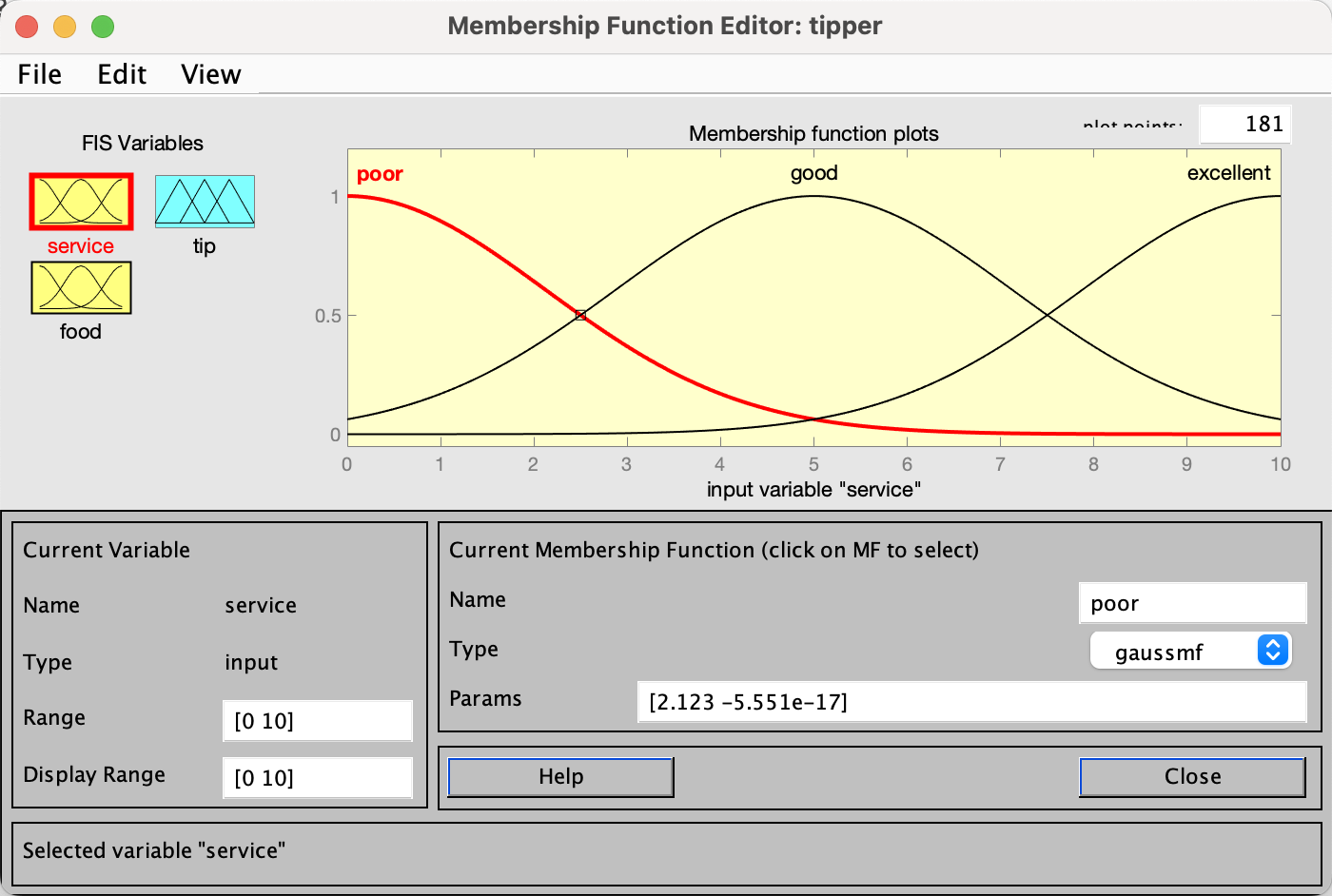 首先编辑service,分为poor、good、excellent三类,隶属度函数选择gaussmf,为高斯型隶属函数。编辑完画面如下。