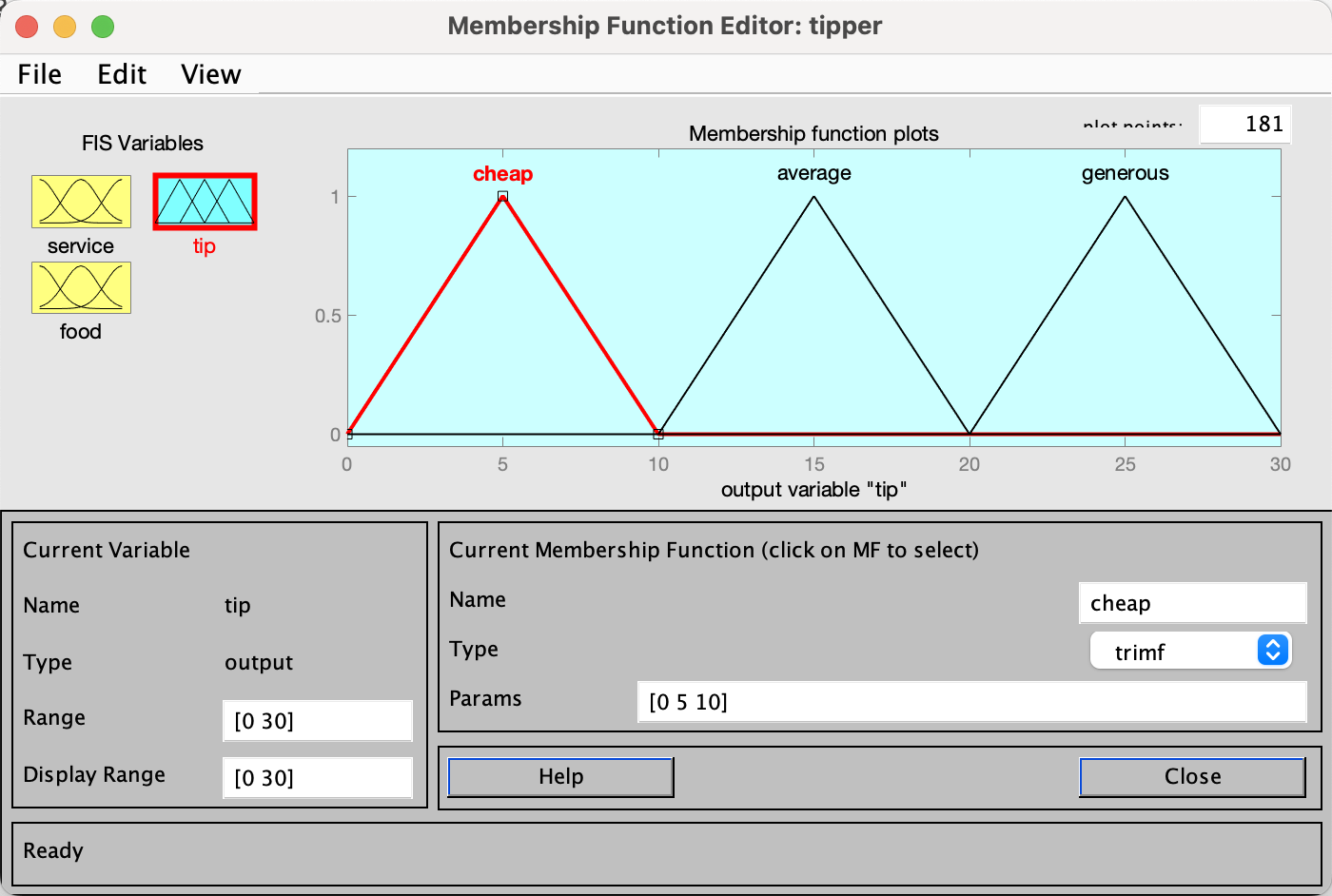 编辑小费tip,小费分为少cheap,正常average,慷慨generous三类,中等小费为15元,小费高为25元,小费低为5元。采用三角形隶属函数(trimf),编辑完画面如下。