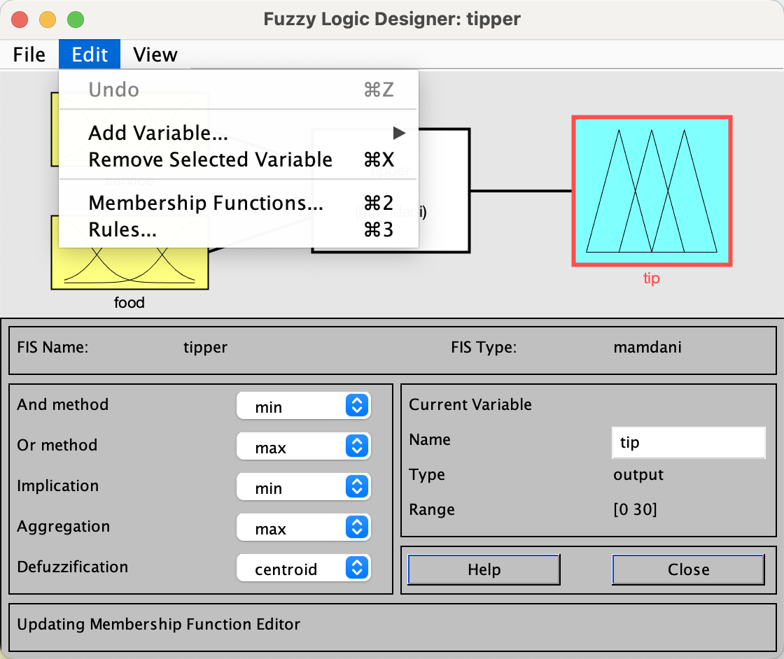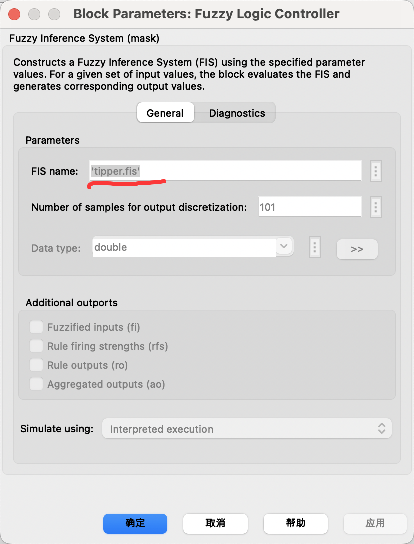 双击fuzzy logic controller,可以看到其属性,已经自动与tipper.fis关联。