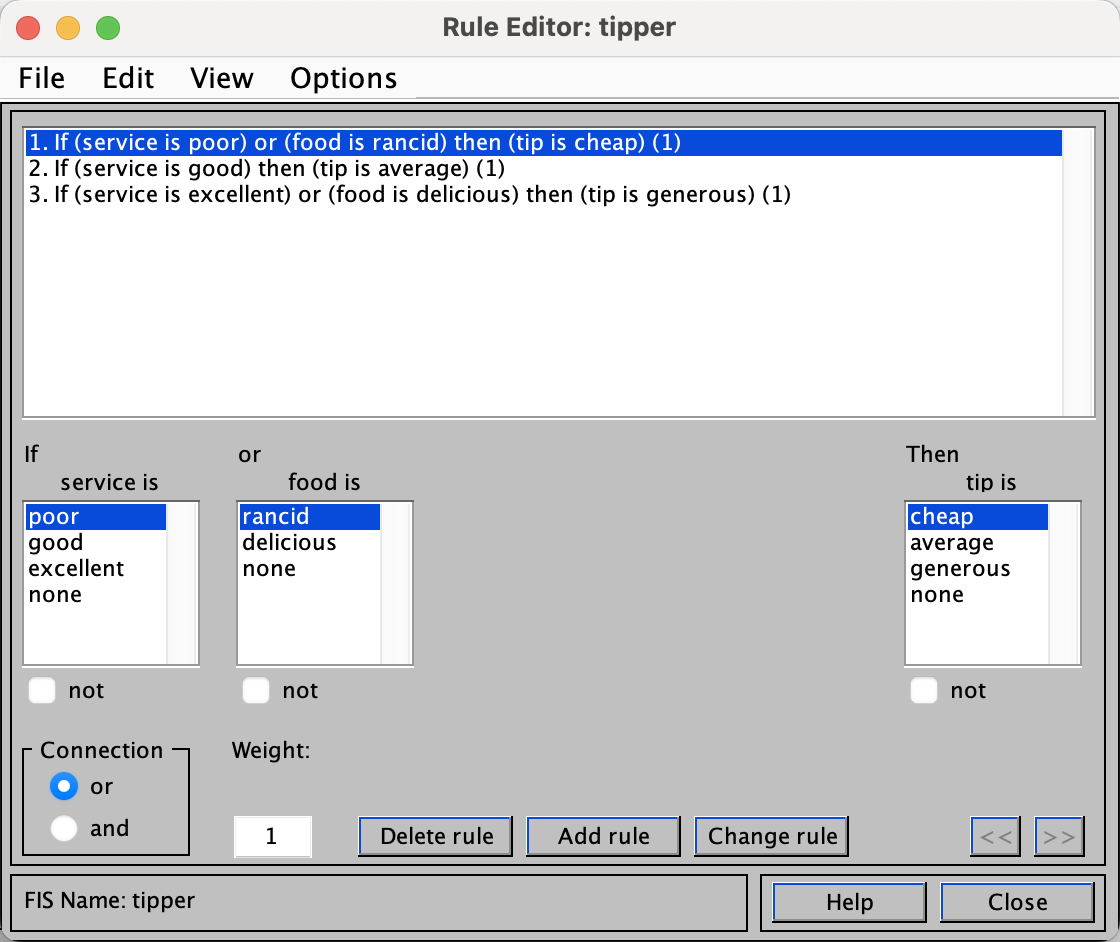 将如果服务差或食品差,那么小费低;如果服务好,那么小费中等;如果服务极好或食品极好,那么小费高这三条文字规则,编辑如下。