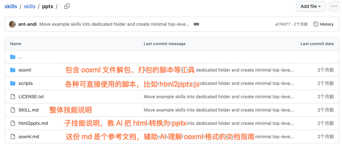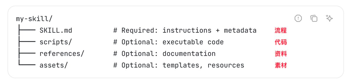 根据标准定义,每个 Skill 都是一个规范化命名的文件夹,其中组合了 Markdown 文档、可执行脚本和其他类型素材文件。