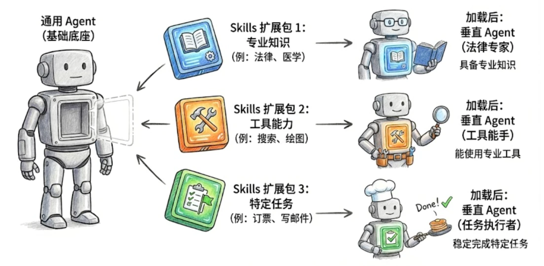 为了更好的理解,你可以把 Skills 理解为"通用 Agent 的扩展包",Agent 可通过加载不同的 Skills 包,来具备不同的专业知识、工具使用能力,稳定完成特定任务。