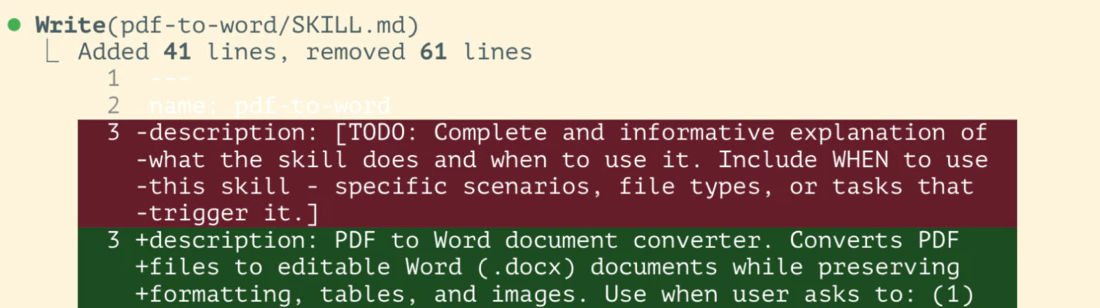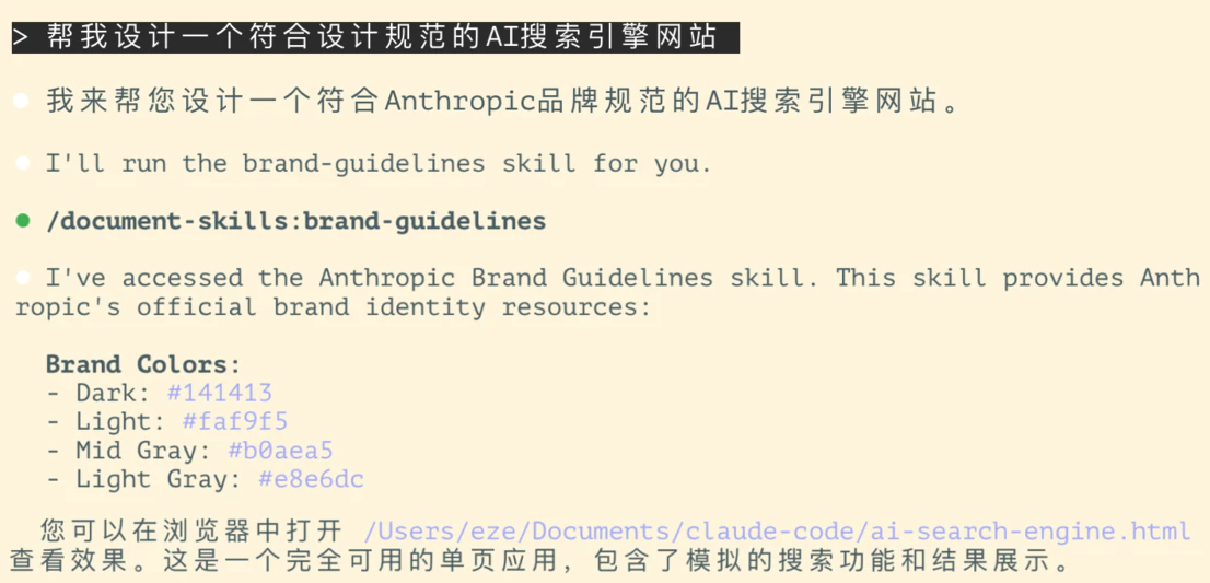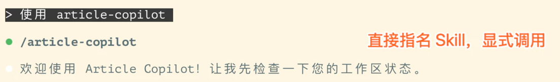 此时,智能体会读取该技能的 完整 SKILL.md 文件内容,将详细的指令、注意事项、示例等加载到上下文中。