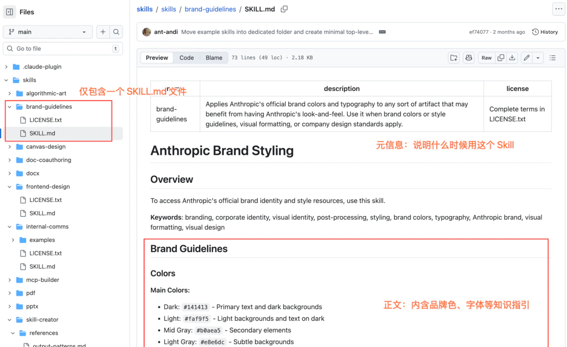 在 Skills 的设计中,每个技能都存放在一个独立的文件夹中,核心是一个名为 SKILL.md 的 Markdown 文件。
