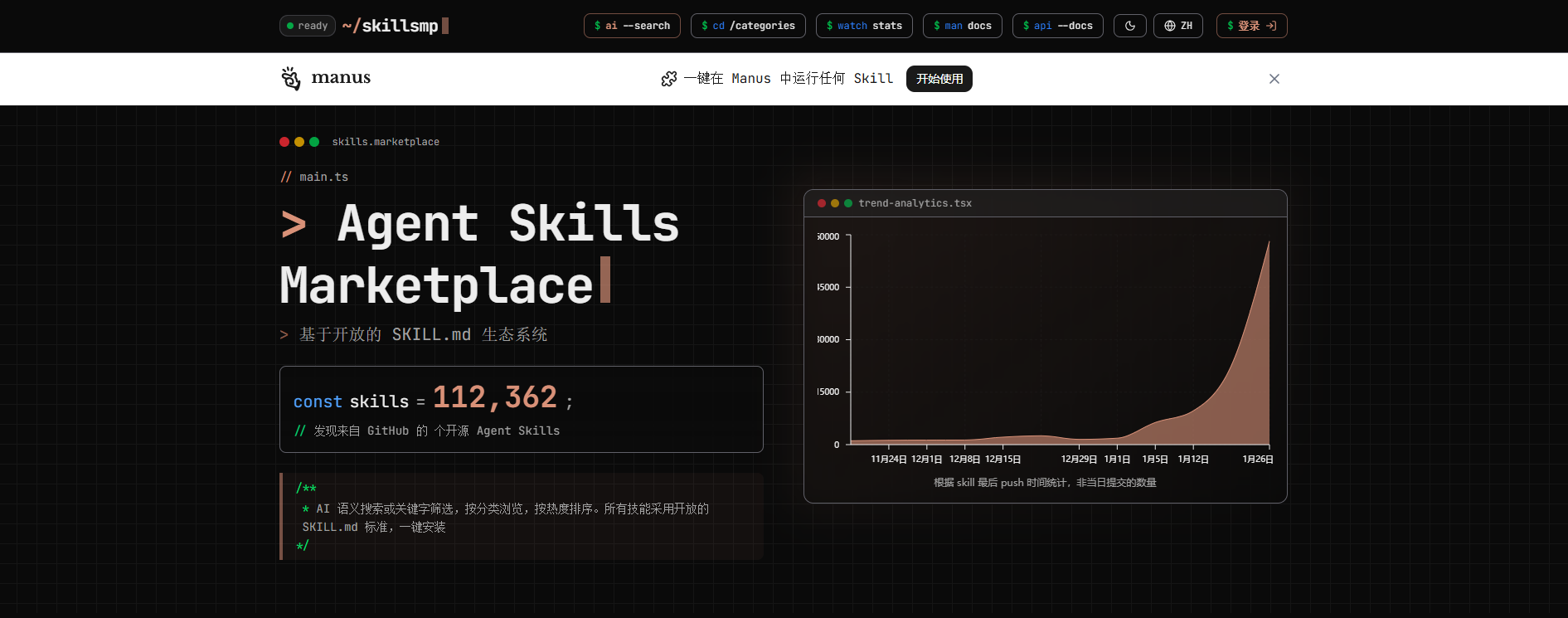 还可以辅助使用 skillsmp 商店,该商店中自动抓取了 Github 上的所有的 Skills 项目,并按照分类、更新时间、Star 数量等标签进行了整理。