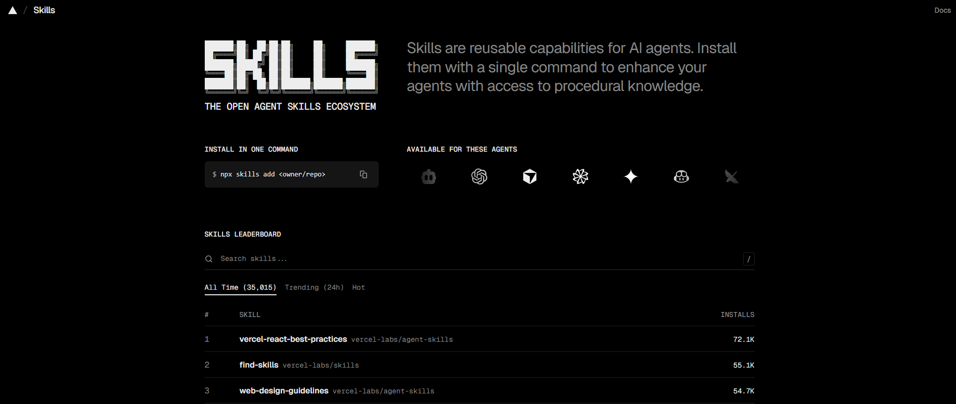 建议使用 Vercel 官方出品的 npx skills add <owner/repo> 命令行工具快速发现和添加 skill,具体参数详见 npmjs/skills。