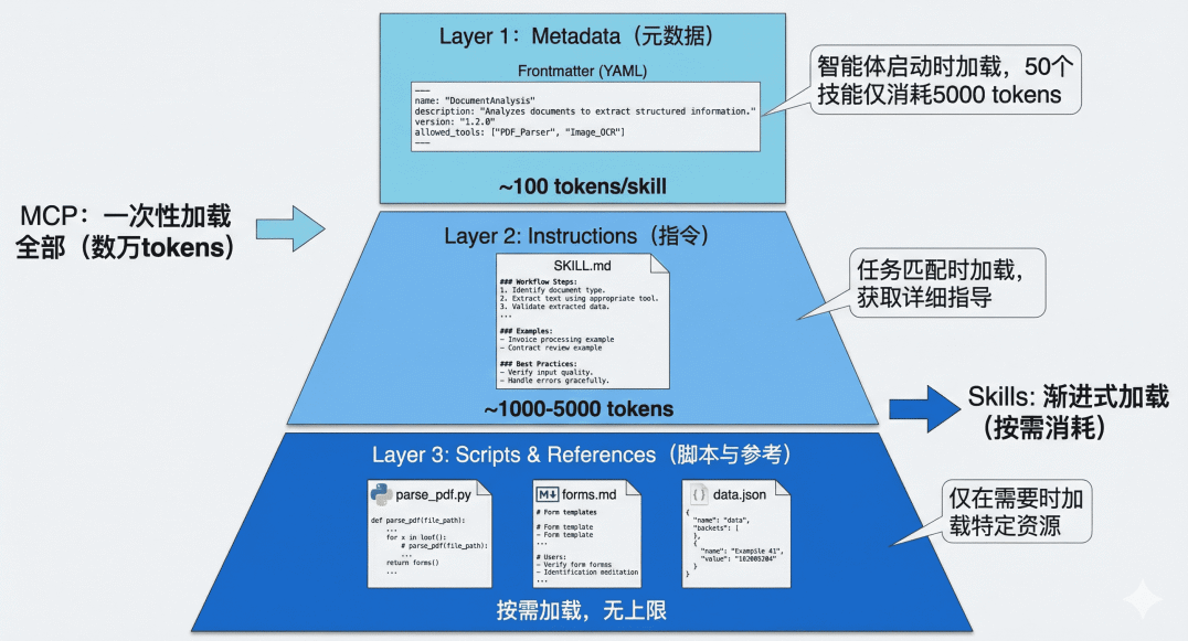 Agent Skills 最核心的创新是渐进式披露(Progressive Disclosure)机制。这种机制将技能信息分为三个层次,智能体按需逐步加载,既确保必要时不遗漏细节,又避免一次性将过多内容塞入上下文窗口。