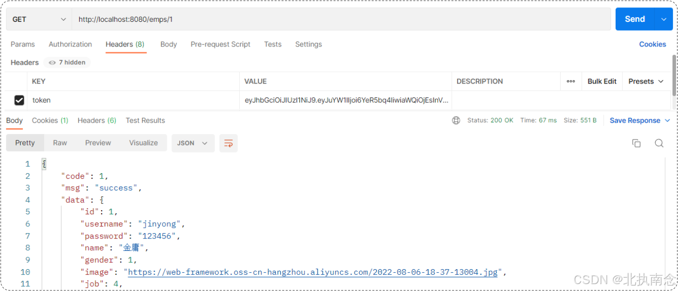 AliOSSUtils,测试使用java@RestController public class UploadController { @Autowired private AliOSSUtils aliOSSUtils; @PostMapping("/upload") public R upload(MultipartFile image) throws IOException { //1.调用工具类 String url = aliOSSUtils.upload(image); return R.success(url); } }