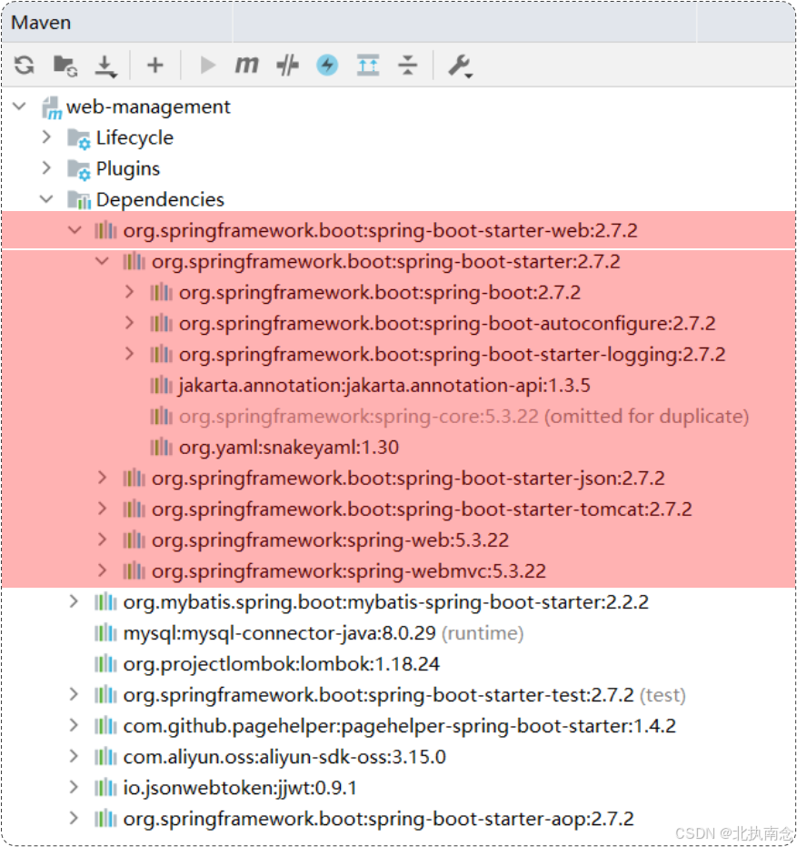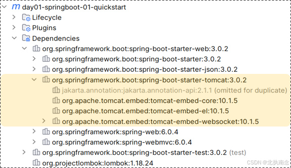 这里看到的spring-boot-starter-xxx 就是 SpringBoot的起步依赖。SpringBoot通过提供众多起步依赖降低项目依赖的复杂度。起步依赖本质上是一个Maven项目对象模型,定义了对其他库的传递依赖,这些东西加在一起即支持某项功能。很多起步依赖的命名都暗示了他们提供的某种或某类功能。