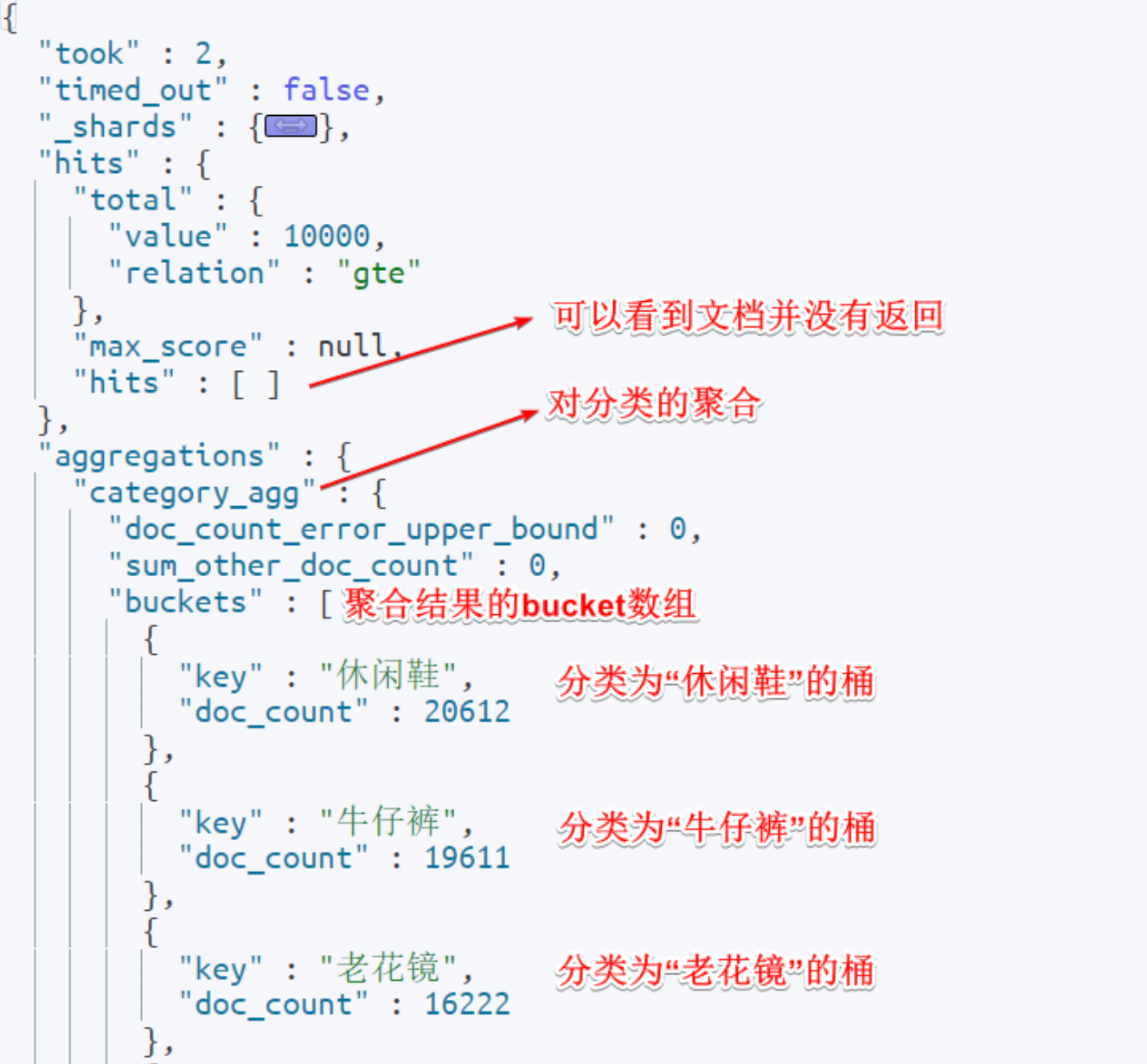 bashGET /items/_search { "size": 0, "aggs": { "category_agg": { "terms": { "field": "category", "size": 20 } } } }语法说明: