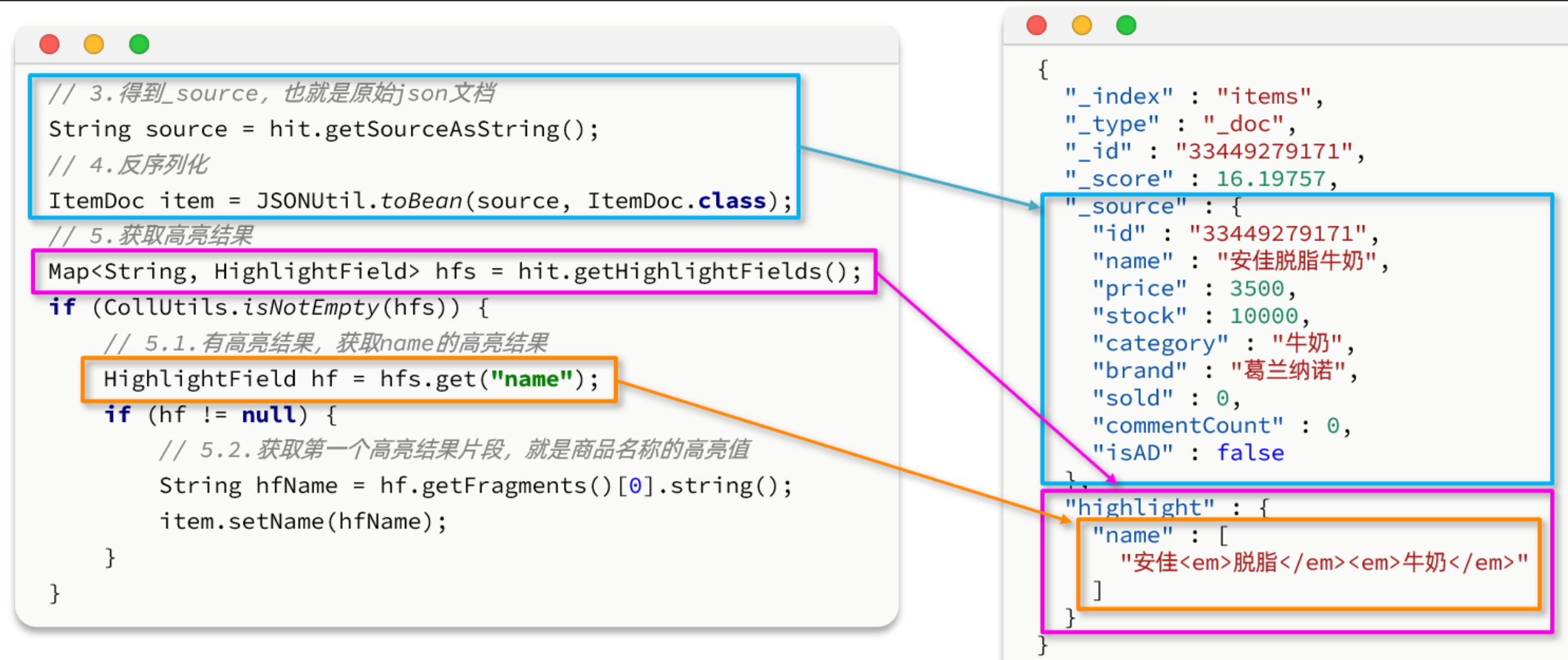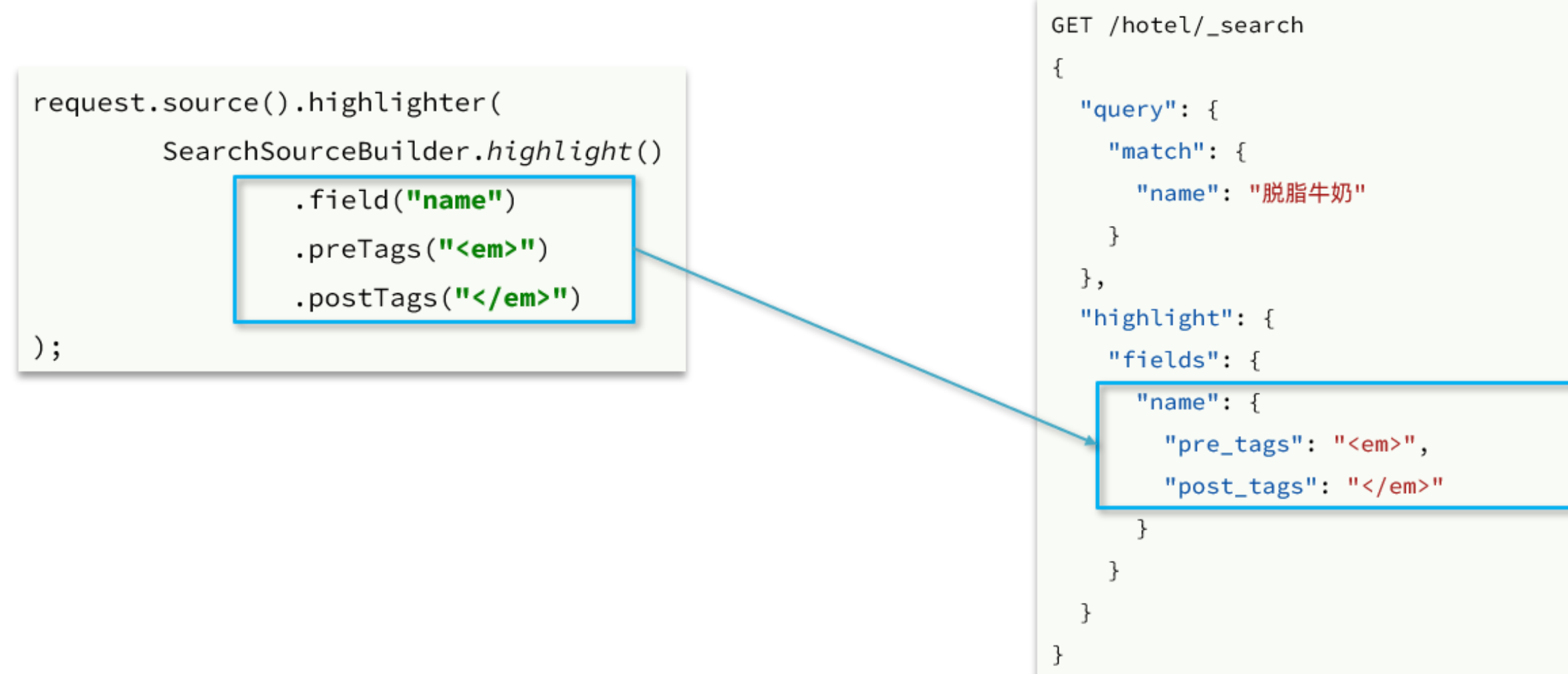 java@Test void testHighlight() throws IOException { // 1.创建Request SearchRequest request = new SearchRequest("items"); // 2.组织请求参数 // 2.1.query条件 request.source().query(QueryBuilders.matchQuery("name", "脱脂牛奶")); // 2.2.高亮条件 request.source().highlighter( SearchSourceBuilder.highlight() .field("name") .preTags("<em>") .postTags("</em>") ); // 3.发送请求 SearchResponse response = client.search(request, RequestOptions.DEFAULT); // 4.解析响应 handleResponse(response); }结果解析的文档解析部分不变,主要是高亮内容需要单独解析出来,其DSL和JavaAPI的对比如图: