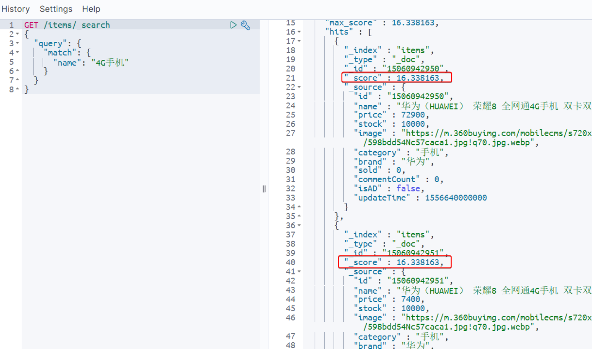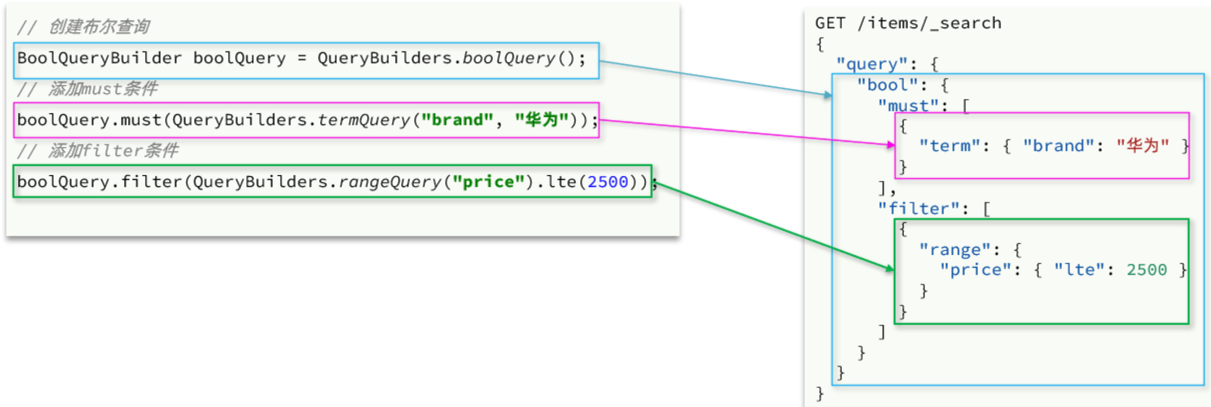 GET /items/_search { "query": { "bool": { "must": [ {"match": {"name": "手机"}} ], "filter": [ {"term": {"brand": { "value": "华为" }}}, {"range": {"price": {"gte": 90000, "lt": 159900}}} ] } } }