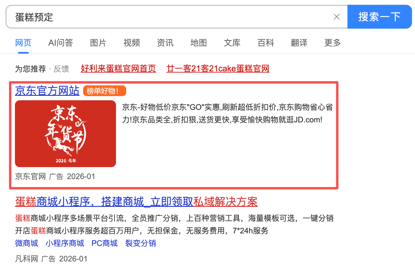例如在百度中搜索蛋糕预定,排名靠前的就是广告推广: