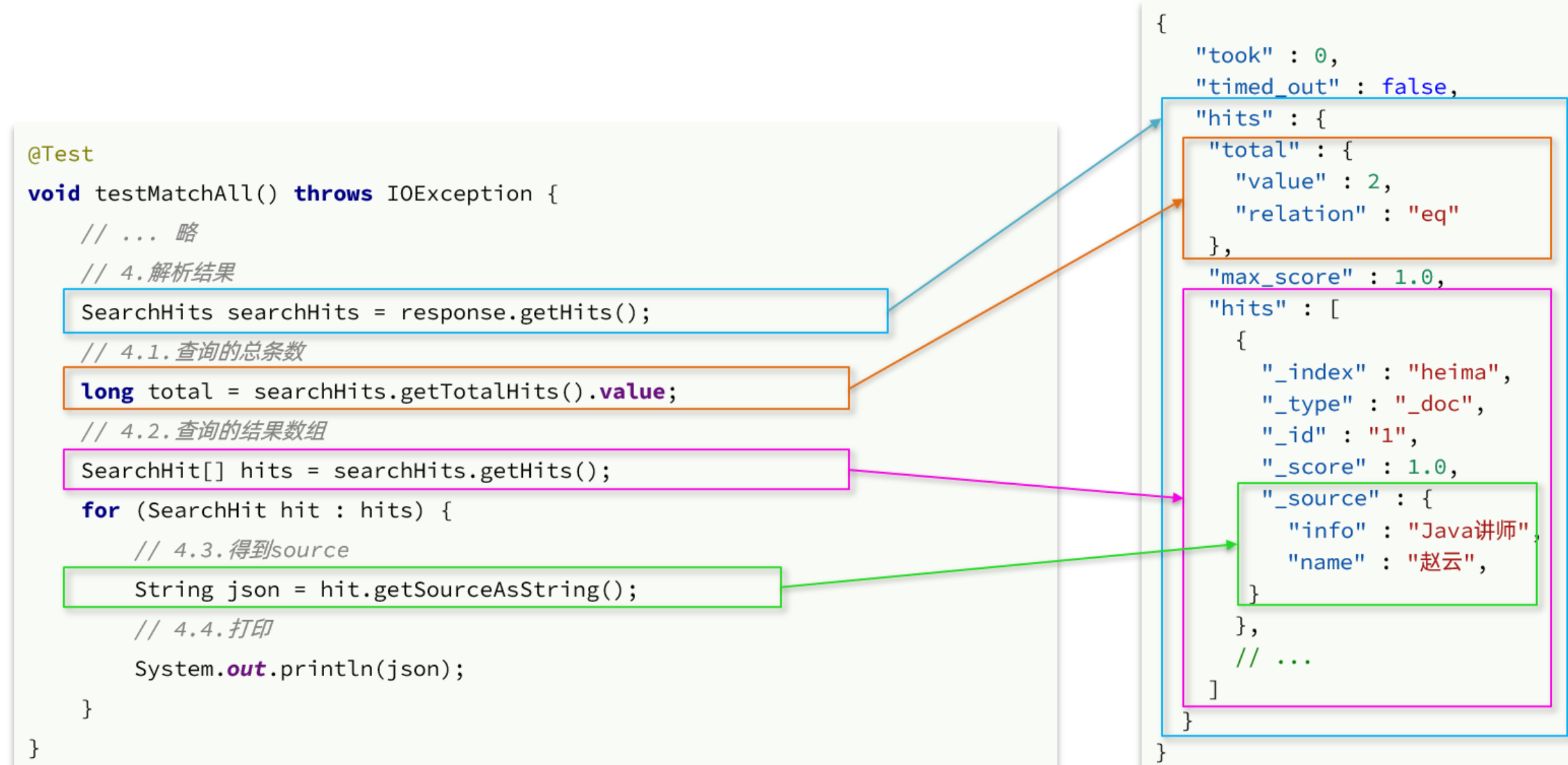 { "took" : 0, "timed_out" : false, "hits" : { "total" : { "value" : 2, "relation" : "eq" }, "max_score" : 1.0, "hits" : [ { "_index" : "heima", "_type" : "_doc", "_id" : "1", "_score" : 1.0, "_source" : { "info" : "Java讲师", "name" : "赵云" } } ] } }因此,解析