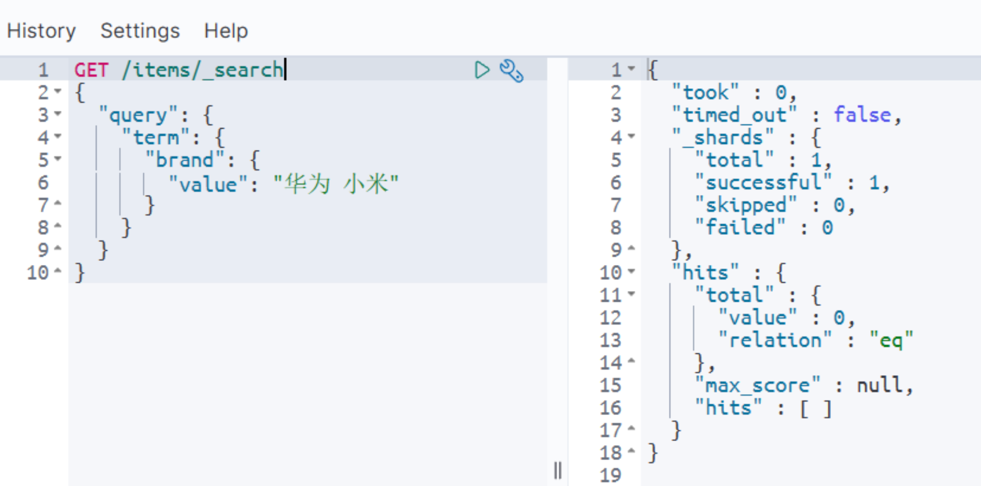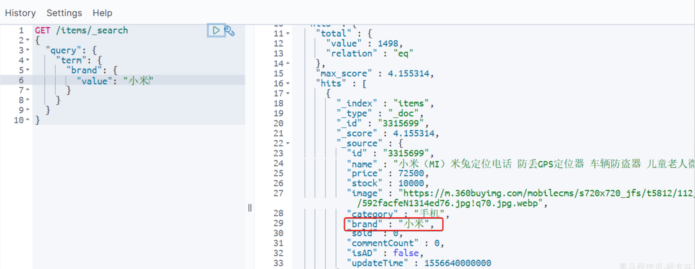 java@Test void testTerm() throws IOException { // 1.创建Request SearchRequest request = new SearchRequest("items"); // 2.组织请求参数 request.source().query(QueryBuilders.termQuery("brand", "华为")); // 3.发送请求 SearchResponse response = client.search(request, RequestOptions.DEFAULT); // 4.解析响应 handleResponse(response); }