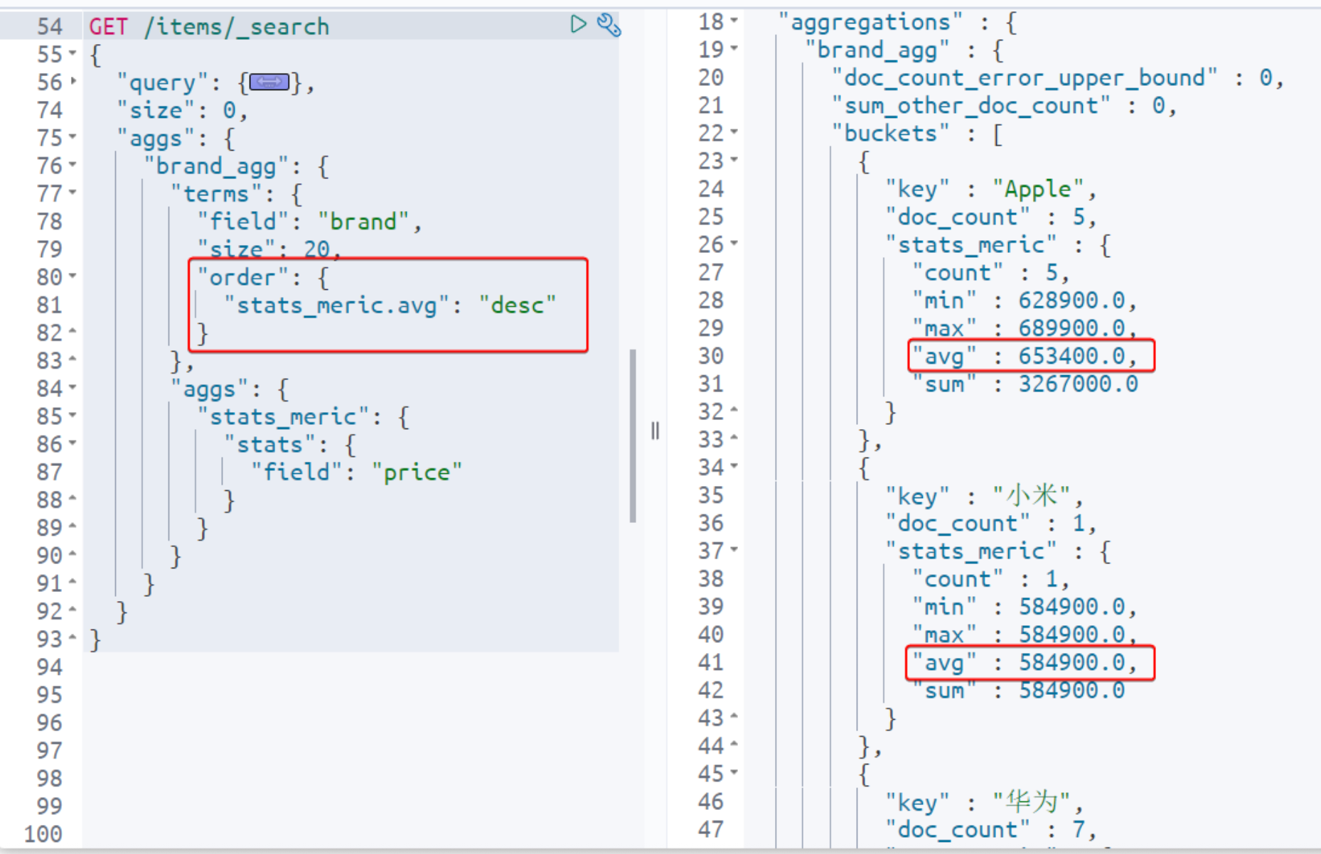 bashGET /items/_search { "query": { "bool": { "filter": [ { "term": { "category": "手机" } }, { "range": { "price": { "gte": 300000 } } } ] } }, "size": 0, "aggs": { "brand_agg": { "terms": { "field": "brand", "size": 20 }, "aggs": { "stats_meric": { "stats": { "field": "price" } } } } } }语法说明: